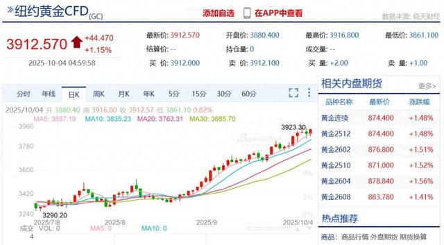 10月4日,COMEX黄金期货收涨1.14%,报3912.1美元/盎司,本周累计上涨3.23%,年内已涨超48%。现货黄金报收3886.47美元/盎司,年内也已涨超48%。
