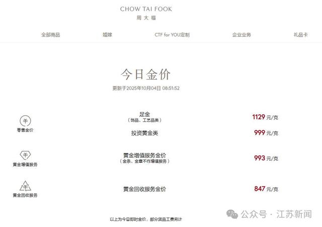 与此同时,10月4日,国内多个金饰品牌金饰克价再创新高。