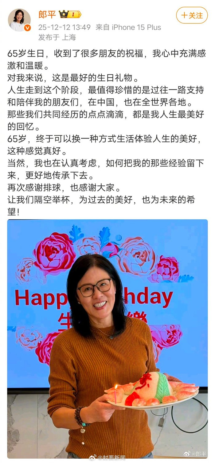 [#郎平65岁生日发文致谢# :感谢排球,也感谢大家]#郎平说65岁终于可以换一种生活# 12月12日,郎平发文:65岁生日,收到了很多朋友的祝福,我心中充满感激和温暖。对我来说,这是最好的生日礼物。人生走到这个阶段,最值得珍惜的是过往一路支持和陪伴我的朋友们,在中国,也在全世界各地。那些我们共同经历的点点滴滴,都是我人生最美好的回忆。65岁,终于可以换一种方式生活体验人生的美好,这种感觉真好。当然,我也在认真考虑,如何把我的那些经验留下来,更好地传承下去。再次感谢排球,也感谢大家。让我们隔空举杯,为过去的美好,也为未来的希望!