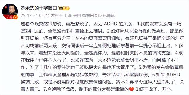 罗永浩表示,多年以来,看起来没出大问题的,全是靠体力、经验和时灵时不灵的药物支撑。现在体力已经不太行了,比如连撑两三天不睡觉心脏会明显不适,而且脑子不工作,吃了十几年的药物已经吃最大剂量也不太管用。“为我的发布会做幕后的同事,工作难度全程都是地狱级数的,每次结束后都需要疗伤。如果ADHD换药失败,或是不能用锻炼彻底改善体能问题,我不会再举办这种大型活动了,会害人害己。”
