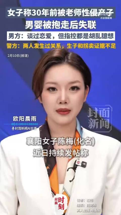 [#女子举报初中老师性侵产子被起诉# 男方:谈过恋爱,对方指控是胡乱臆想]#女子回应举报老师性侵产子抱走娃# 近日,湖北襄阳,陈梅持续发帖举报称,30年前,自己初二时被生物老师强奸,事后怀孕诞下男婴,却被对方抱走后失联。当事#教师回应被举报强奸学生拐走孩子#,称对方的指控是胡乱臆想,“两人在陈梅毕业后恋爱过,之前未发生过关系,也无强奸、生子的事。”目前已经以诽谤、名誉损害的理由向法院起诉陈梅。陈梅表示,警方查实了双方1995年发生关系,“当时我未成年。虽然过了强奸罪的追诉期,我希望能写明确,但他们书面没写明确。”陈梅还称,高强一家人到处污蔑她,她也起诉了高强,2月5日案件第二次开庭审理,目前尚未宣判。对此,襄阳警方回应:两人发生过关系,生子和拐卖证据不足。