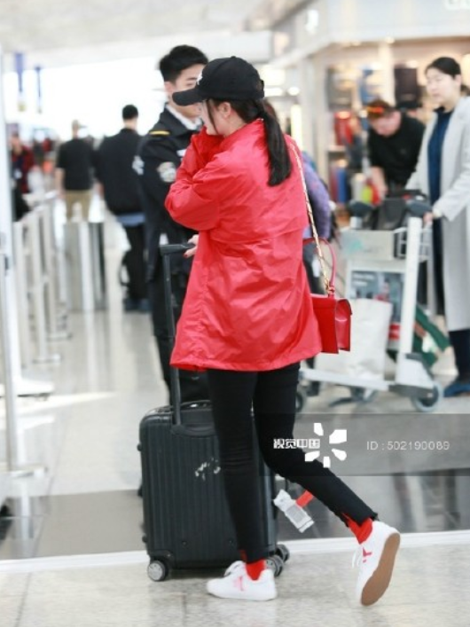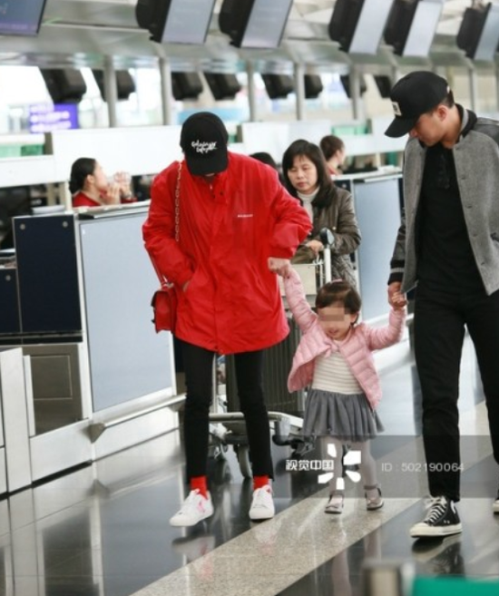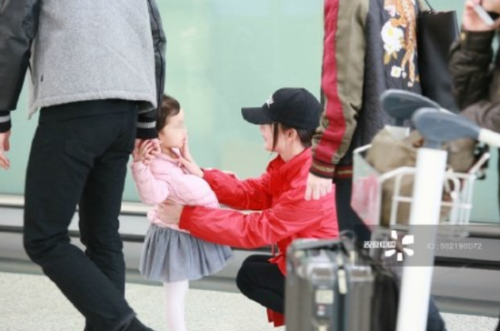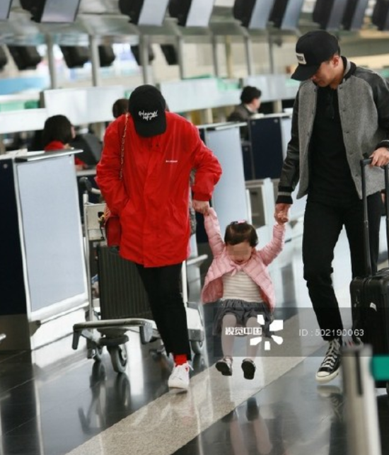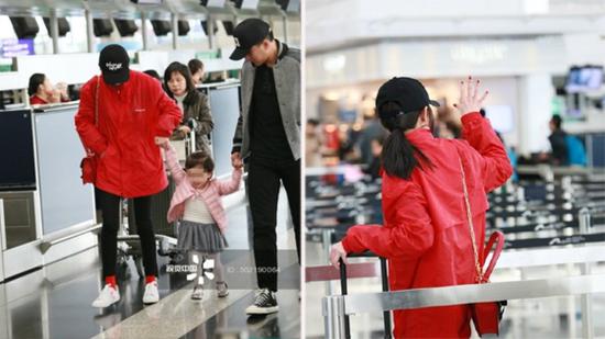 照片中,杨幂身穿红色外套,和刘恺威都带着帽子,夫妻俩牵着女儿小糯米,充当“人肉秋千”,一家三口其乐融融,不亦乐乎。送别杨幂,刘恺威领着女儿离开机场。
