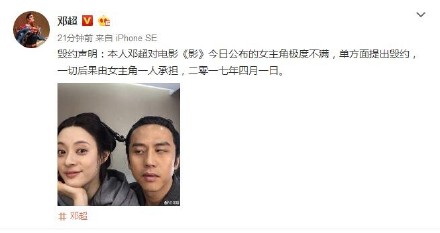 4月1日报道 日前张艺谋电影《影》公布女主孙俪 ,继2015年《恶棍天使》孙俪邓超上演夫妻档后再次合作。邓超今日下午发微博调侃:“对今日公布的女主角极度不满,单方面提出毁约,一切由女主角承担,二零一七年四月一日”。