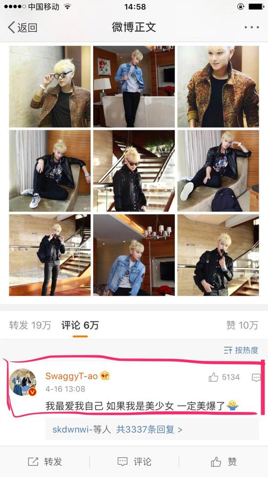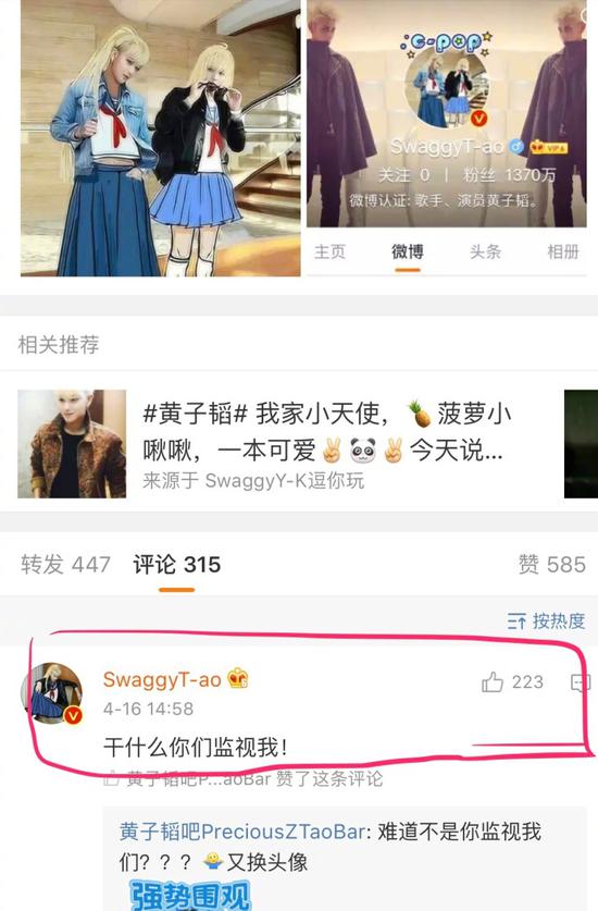 对此,有网友转发表示韬韬真可爱,黄子韬还回复道,“今天心情好,来微博玩儿下!”被粉丝第一时间捕捉动向的韬韬还回复道,“干什么你们监视我!”看到wuli韬韬如此活跃,粉丝们纷纷表示,“韬韬的内心是小美眉!”也有粉丝哭笑不得,“是我爱豆!这头像一层一层的水印!”