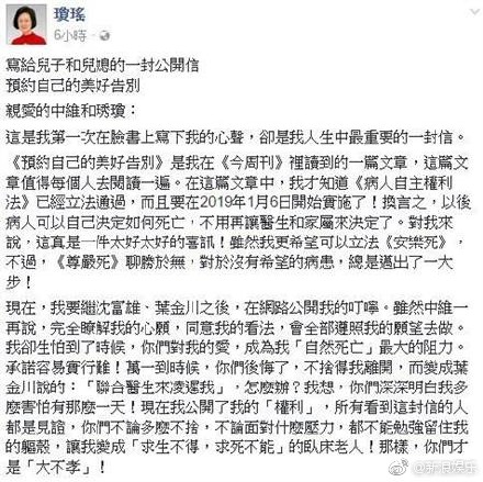 琼瑶日前公开遗书,倡导“尊严死”,原来都是因为见了卧病在床的丈夫,她不忍对方承受插鼻胃管的痛苦,但继子女却坚决要让爸爸插管,并要她打电话给侯文咏,因为侯文咏曾是她的“家庭医生顾问”,有疑难杂症都会找他咨询一下。