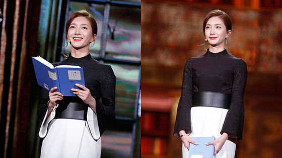 近日,一组江疏影录制《朗读者》的现场照曝光。图中的江疏影造型简约,黑衣白裙十分优雅干练,标志性的红唇更平添几分柔软与妩媚,与主持人董卿共同登台,相得益彰。