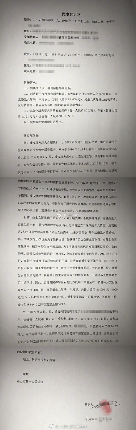 今年3月,刘洲成向林苗提出离婚,还说如果给他500万在中山买套房就不离。。。。