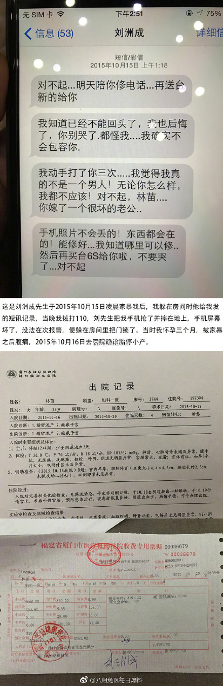 10张林苗在声明中说到,15年10月,刘洲成对怀孕3个月的她实施家暴,导致其腹痛,然后小产。