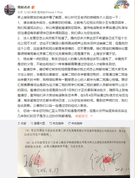 7张6月9日中午,王自健前妻就王自健今晨针对相声社第二班复演一事发表回应,她还曝出离婚协议书向公众澄清,北京第二班文化发展有限公司法人代表是自己,并非王自健。而离婚协议书也表明二人早在2016年11月离婚。