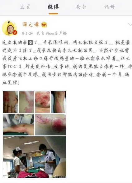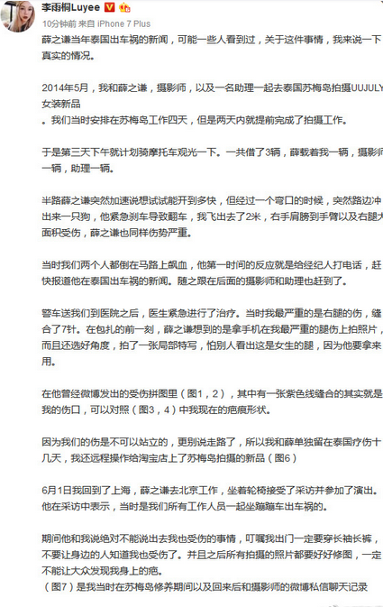 薛之谦前女友李雨桐再爆料,薛之谦和她两人在泰国出车祸,薛之谦不顾她的安危,第一时间想到打电话给经纪人出新闻稿。她还爆料薛之谦微博所晒车祸照片为女方腿伤照,还叮嘱她受伤的事情千万不能暴露,“不要让身边的人知道我也受伤了。