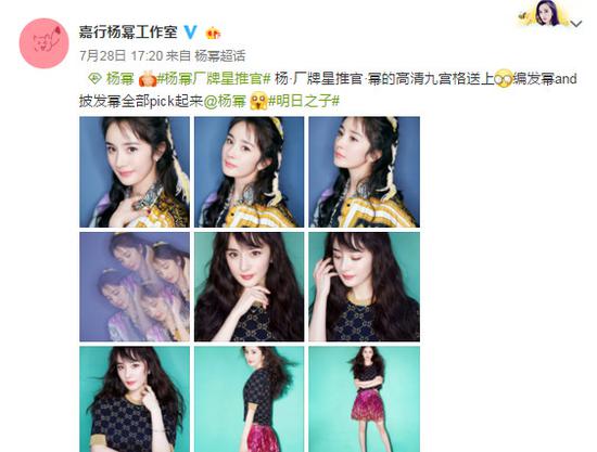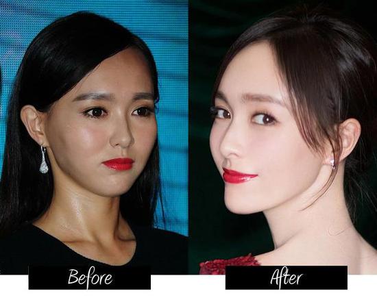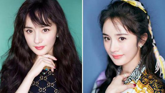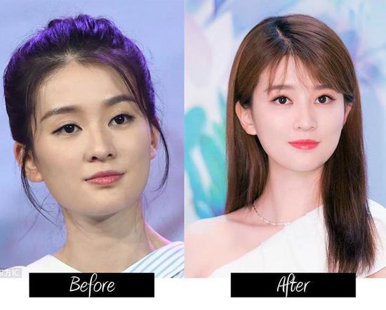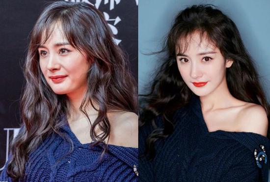 那为啥这次的空气感齐刘海就这样扑街了呢?其实这是因为杨幂面部的下庭比较长,尤其是下巴比较尖,虽说空气感齐刘海能够掩饰额头过大、发际线后移的问题,但同样会让人将视觉聚焦到下庭,让下巴变得更长不说,因年龄问题而逐渐明显的八字纹也变得更加突兀,给人年龄感。看看即使是精修图,明明是杨幂工作室同时间发的一组宣传图,是不是右边的侧分流海比空气齐刘海更适合杨幂。