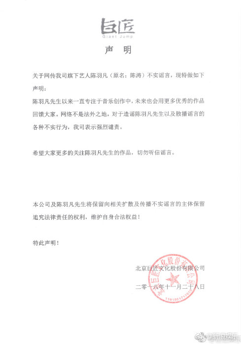 11月28日,有网曝消息称歌手羽凡因吸毒被抓。刚刚,陈羽凡公司@巨匠娱乐 发表声明,否认网曝关于陈羽凡的不实传闻,称:“陈羽凡先生一直专注于音乐创作中。”并表示“对于造谣陈羽凡先生以及散播谣言的各种不实行为,我司表示强烈谴责。”