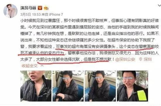 和很多面对性骚扰沉默的女明星不同,马丽则是勇敢地发声。之前马丽在超市遇到变态性骚扰,并发布变态打码照,并直接 @深圳公安。强烈表示自己态度:大部分女生都会选择沉默,但我不想沉默。