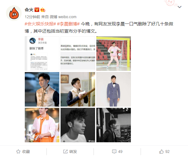 范冰冰代言的热度还没有下去,这边李晨又传出了新情况,有营销号发微博爆料称李晨今晚删除了几十条微博,其中就包括他和范冰冰官宣分手的博文。