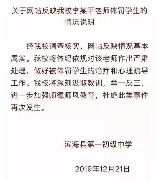经我校调查核实,网帖反映情况基本属实。我校将依纪依规对该老师作出严肃处理,做好被体罚学生的治疗和疏导工作。我校将深刻汲取教训,举一反三,进一步加强师德师风教育,杜绝此类事件再次发生。