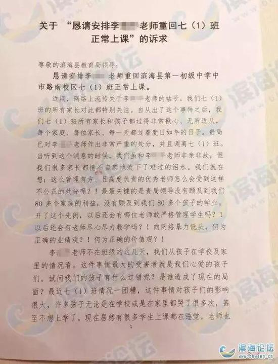 12 月 22 日,一份题为 “ 关于‘恳请安排李某某老师重回七(1)班正常上课’的诉求 ” 的请愿书在网上流传开来。