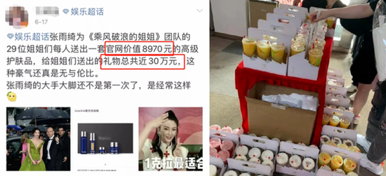 参加《乘风破浪的姐姐》送了其他 29 个姐姐每人一套 8000+ 的肤护品,算下来近 30 万。来站台的粉丝,也是人手送了一杯奶茶。人前霸气侧漏,让同台竞技的女歌手给她让位,台下的人情一点儿没少送。▼