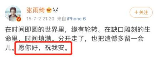 他因为个人作风问题被捕后,张雨绮用一句“愿你好,祝我安”果断宣布了分手。▼