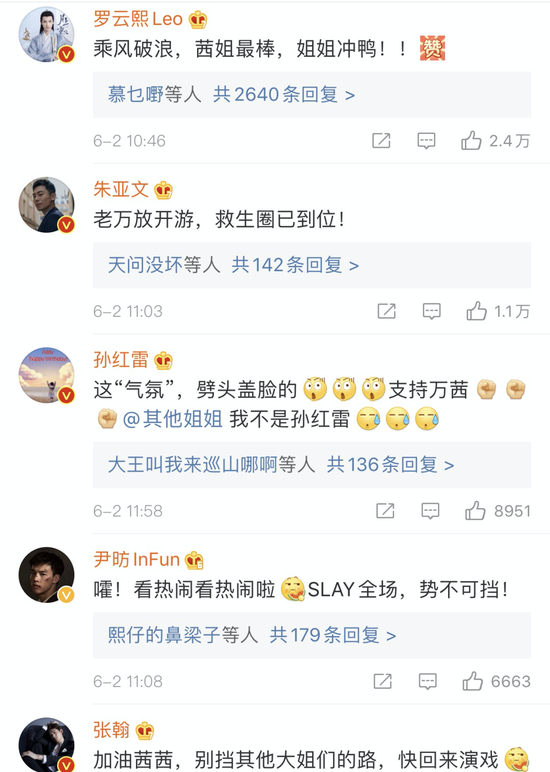 有网友评论说:‘我的男人们在万茜的微博下面集合了’。