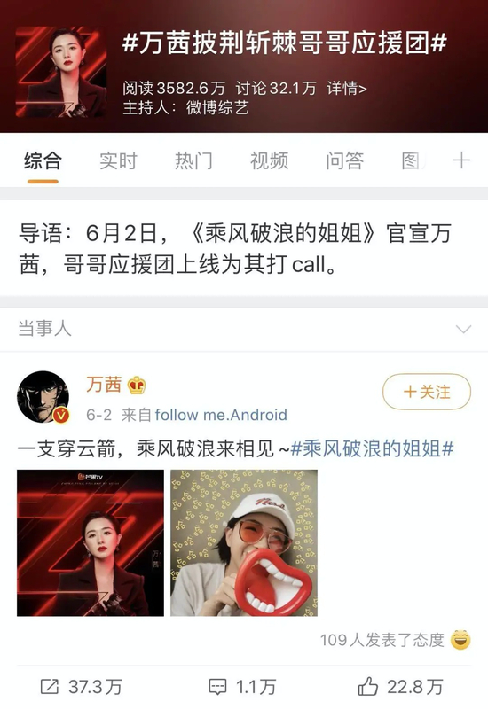 早在节目官宣的时候,她就带着半个娱乐圈的应援来了,甚至还有#万茜披荆斩棘哥哥应援团#的专属话题。
