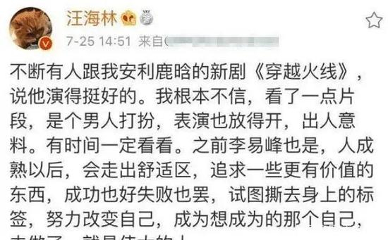 就连编剧王海林都在微博发文称“看了一段片段,鹿晗这次的表现出人意料,有时间一定要好好看看”,要知道王海林之前一直看不上鹿晗的,公开说他是“娘P”,还在《吐槽大会》上吐槽鹿晗。