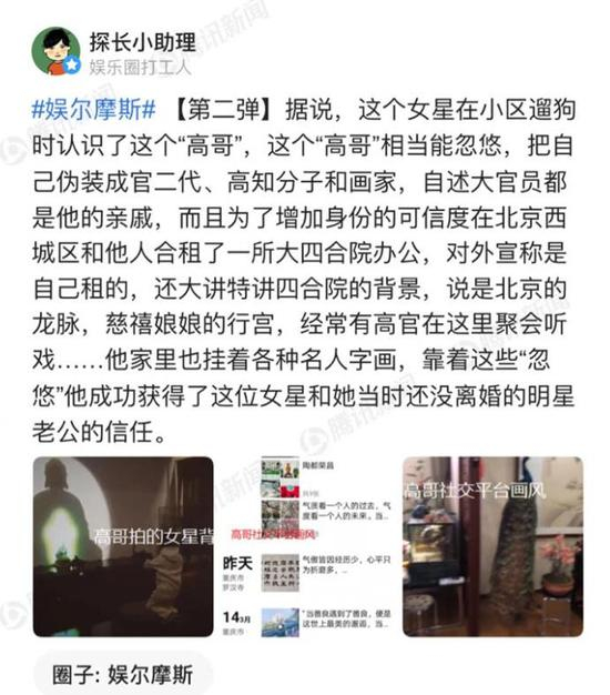 根据爆料,李小璐和贾乃亮夫妇在还没离婚前遇到过一位神秘的高哥,这位高哥将自己伪装成自己是官二代、高知分子和画家,还租了一个大四合院办公,家里还有各种名人字画看上去价格不菲,李小璐贾乃亮于是就和“高哥”成了好朋友。
