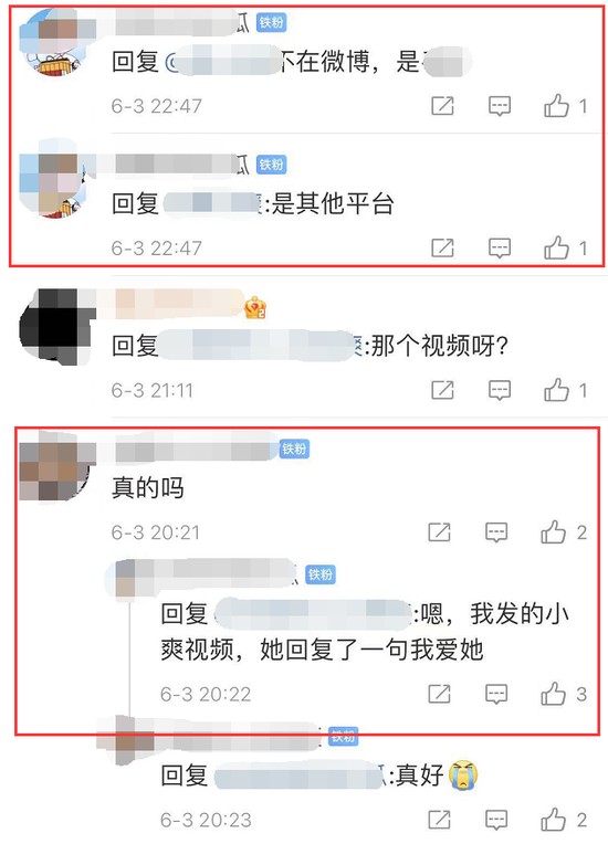 有粉丝称,自己在该社交平台发了小爽的视频,表姐还在下面回复了“我爱她”。
