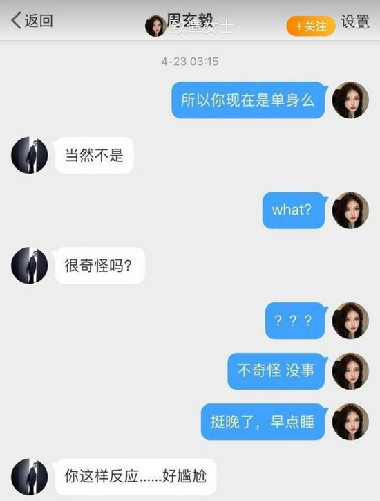 谭女士晒出的聊天记录表明,她在初识时已经问过周玄毅是否单身,