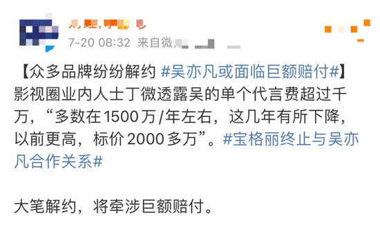 吴亦凡多个代言终止面临巨额赔付 赔偿金额曝光