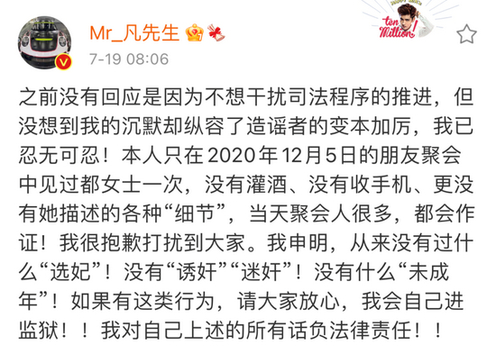 7月20日,吴亦凡丑闻风波仍未落下帷幕。他昨日发文称自己是清白的,只和都美竹见过一面,而且没有任何“选妃”行为,如果有违法行为甘愿自己进监狱,随后工作室也表示已经启动法律追责程序并完成了报案,似乎要和都美竹硬刚到底。
