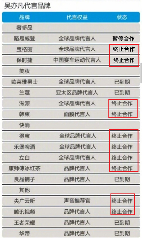 除此之外,路易威登宣布与吴亦凡暂停合作,欧莱雅男士、兰蔻、良品铺子、王者荣耀、华帝这四个品牌则是与他的合约到期,到期的话应该不需要再额外支付赔偿金。