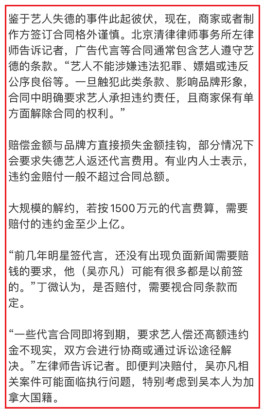 有法律界权威人士表示,目前广告代言等合同通常包含艺人遵守艺德的条款,“一旦触犯此类条款、影响品牌形象,合同中明确要求艺人承担违约责任,且商家保有单方面解除合同的权利,”部分情况下会要求失德艺人返还代言费用,违约金赔付一般不超过合同总额。