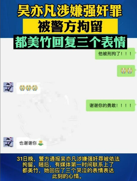 有网友也是把吴亦凡被刑拘的事情,告诉了都美竹,而女方则是发了三个喜极而泣的表情包,并且还感谢了网友