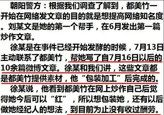 让事件升温的是网络写手,由网络写手从7月份开始使用都美竹微博,撰写经过加工的事实,引发强烈的舆论效应。