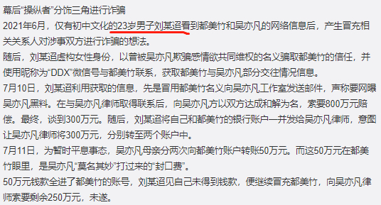 双方被诈骗犯耍得团团转,让吴亦凡和都美竹互相敌视。而吴亦凡的母亲也正式报警称遭敲诈,而屡次在微博中控诉吴亦凡“迷奸”的多位,包括都美竹本人,其实都没有向警方进行报案。