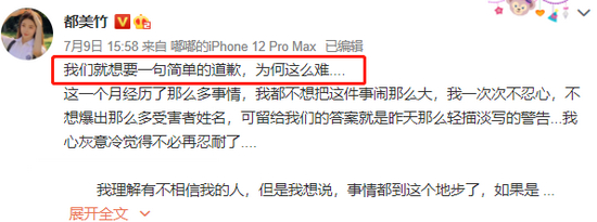 都美竹想要的一直都是吴亦凡的道歉,从在微博中联合自己的朋友发声后,没有换来对方的真诚道歉,相反迎来了律师函警告。而从她发声开始,另外几十位同样遭遇的女性也接连发声,都是一样的结果,没有道歉,只有律师函。