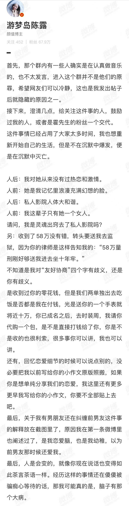 陈露否认了几点指控,令人印象最深刻的是两人恋爱期间,他们对于谁给谁花钱的争议。