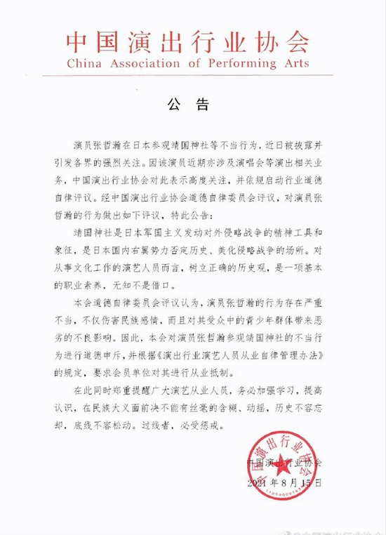 中国演出行业协会最新发表红头文件,其中明确提到:要求会员单位对演员张哲瀚进行从业抵制。