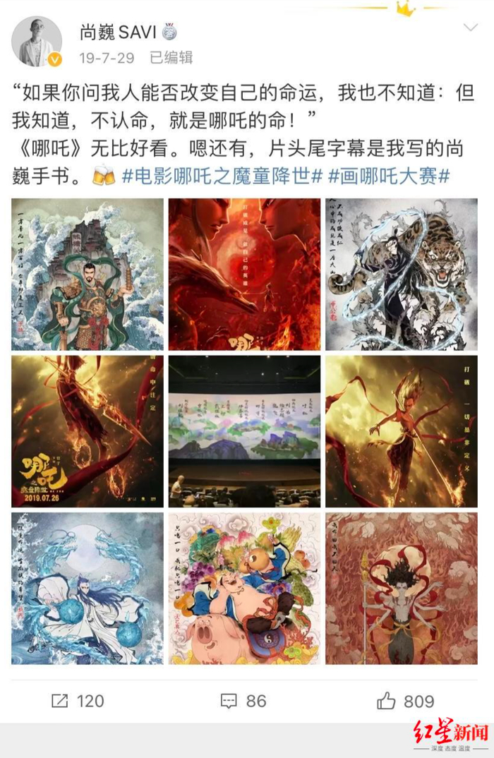 尚巍曾在微博表示《哪吒之魔童降世》片头尾字幕是他写的尚巍手书