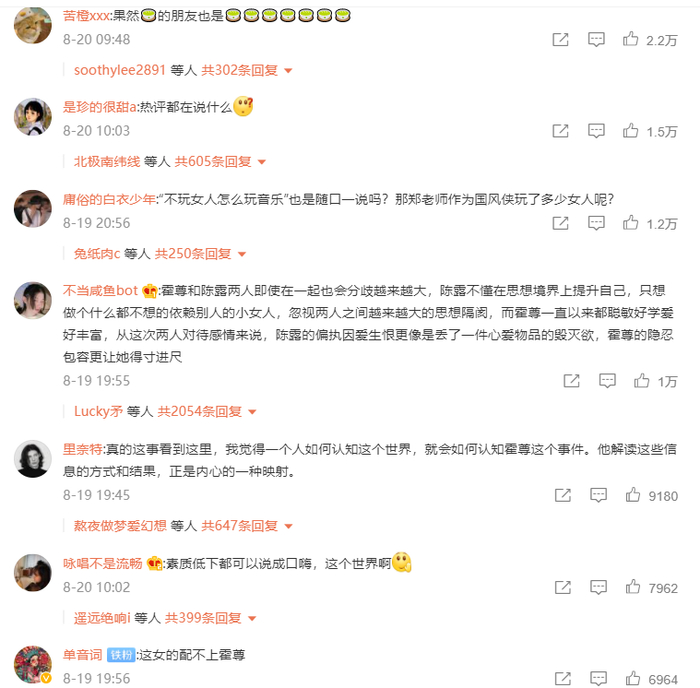 还有人支持霍尊,比如他们说:“感谢郑老师帮助澄清,多开导开导他,霍尊正直真诚善良好学不倦的好青年,希望他坚强起来,歌迷们都在的,我们爱他。”“郑老师,能否放一下霍尊说‘女人要是这个样子我会打死他’是针对新闻,而不是针对陈露的证据。”