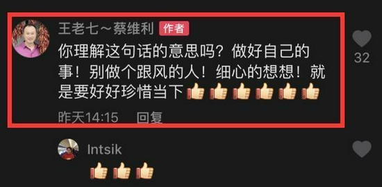 面对网友的恶评,蔡维利在和网友的互动中表示:“没必要把我和逝者联系到一起,活好自己”,还自己留言称:“你理解这句话的意思吗?做好自己的事!别做个跟风的人!细心的想想!就是要好好珍惜当下”。