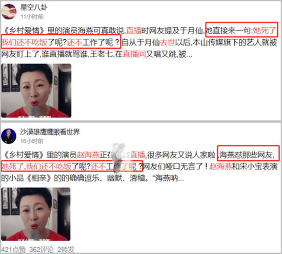 赵本山的徒弟海燕在直播时,有很多网友提及于月仙,海燕直接在直播中回击网友称:“她死了,我们还不吃饭了呢?还不工作了呢?”,虽然看上去有点不太尊重逝者,但是也实属无奈,被有些网友的留言逼的没办法了。