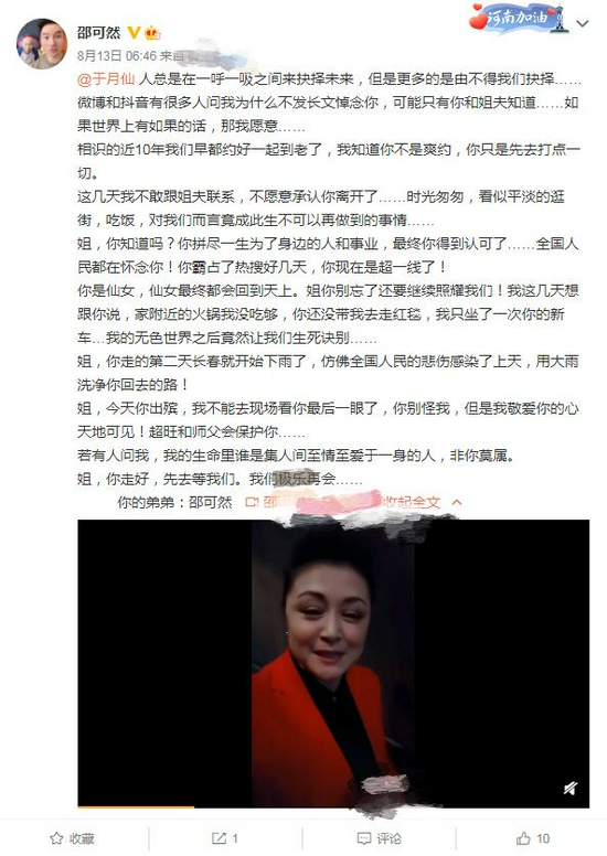 于月仙遗体告别式当天,邵可然因为没能赶到现场,在微博发文悼念,在文末透露了他和于月仙的关系,他是于月仙的弟弟。