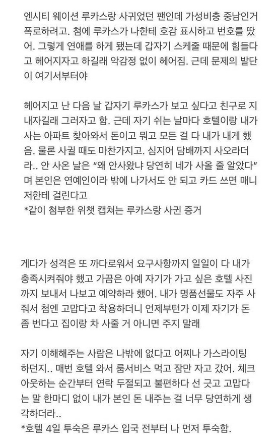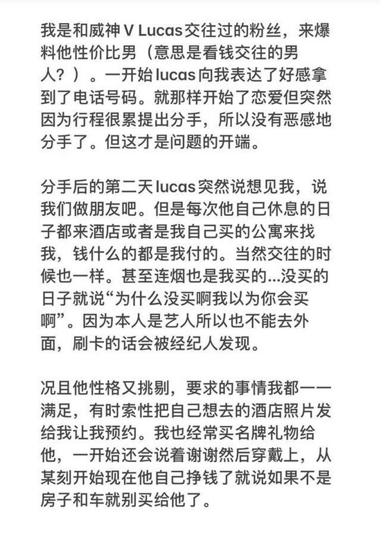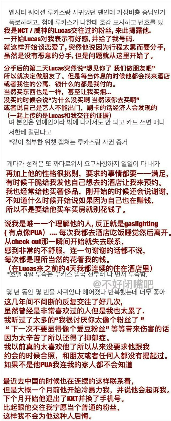 8月23日,有韩国网友在社交网爆料,指自己是一名粉丝,与NCT成员黄旭熙谈恋爱,并附上了多张聊天记录以及照片,也公开了对方的聊天语音,引发新一轮的“塌房”危机。