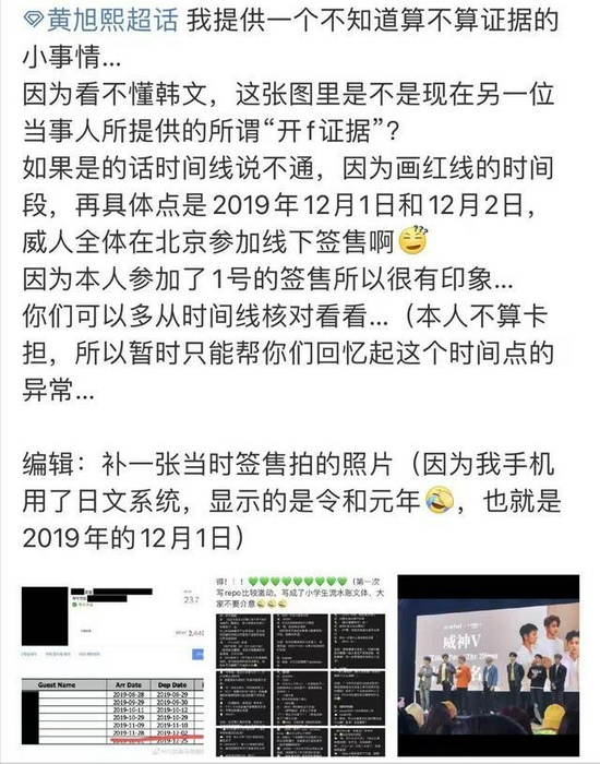 另外,黄旭熙粉丝发现,在爆料中显示的开房日期,有那么几天时间,黄旭熙本人不在韩国: