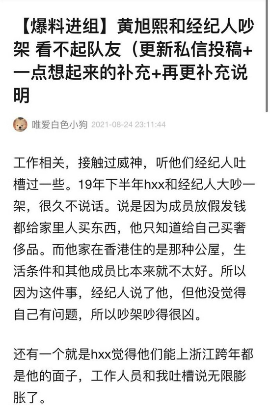 还质疑黄旭熙成名后,单是上《奔跑吧》一季最少有千万进帐,却只顾自己买奢侈品。而自称因工作关系接触过威神V的网友亦表示,得悉2019年黄旭熙曾因没有向家人汇钱而与经理人吵架。