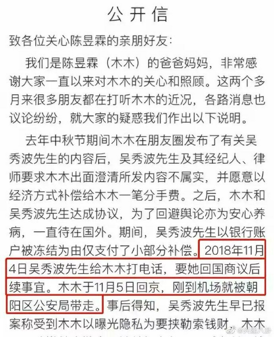 2019 年年初,陈昱霖父母发文称吴秀波哄骗陈昱霖回国后,女生在机场直接被公安带走了。