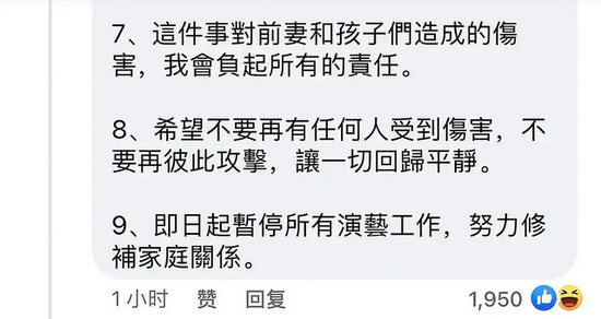 4、前妻所说的部分内容不是事宝,是认知上的落差,误会一场,请各界不要过度揣测,也不要归咎其他人,都是我一个人的责任。