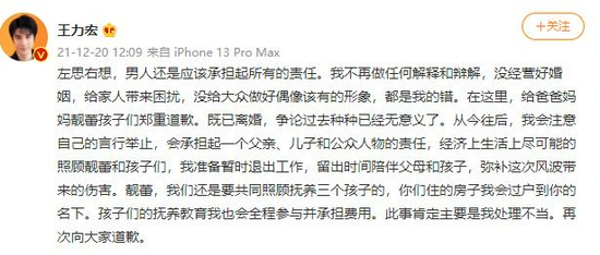 左思右想,男人还是应该承担起所有的责任。我不再做任何解释和辩解,没经营好婚姻,给家人带来困扰,没给大众做好偶像该有的形象,都是我的错。在这里,给爸爸妈妈靓蕾孩子们郑重道歉。既已离婚,争论过去种种已经无意义了。从今往后,我会注意自己的言行举止,会承担起一个父亲、儿子和公众人物的责任,经济上生活上尽可能的照顾靓蕾和孩子们,我准备暂时退出工作,留出时间陪伴父母和孩子,弥补这次风波带来的伤害。靓蕾,我们还是要共同照顾抚养三个孩子的,你们住的房子我会过户到你的名下。孩子们的抚养教育我也会全程参与并承担费用。此事肯定主要是我处理不当。再次向大家道歉。