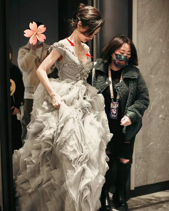 若是离开精修照,关晓彤可能不占优势,这类露胳膊遮大腿的礼服容易暴露出她的身材短板,极易导致宽大臃肿的错觉。